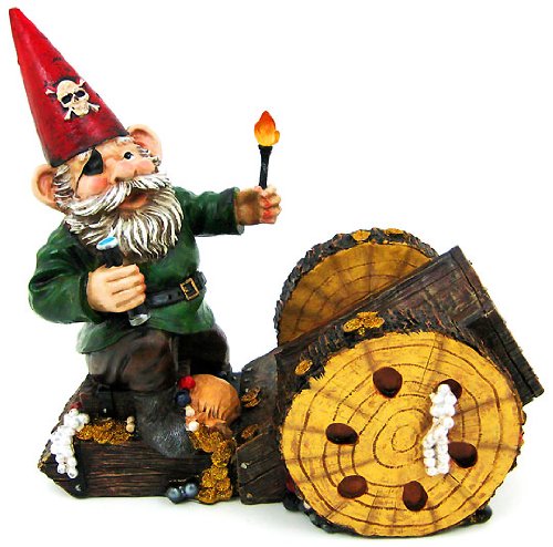 This awesome bottle holder figurine of a pirate garden gnome firing a cannon is great for holding wine bottles, liquor bottles, or for holding olive oil as part of your kitchen decor. Made of cold cast resin, the holder stands 9 1/2 inches tall, is 10 inches wide, and 5 1/4 inches deep. It makes a great gift for any pirate or gnome lover.