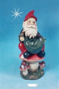 Very cute and happy gnome is waiting to live in your garden or yard and feed your birds. Nice detail. Size 24in approx tall. Welcome addition to your flower beds or yard. Gnome is sitting on a mushroom. The feeder is a leaf that you fill with seed.